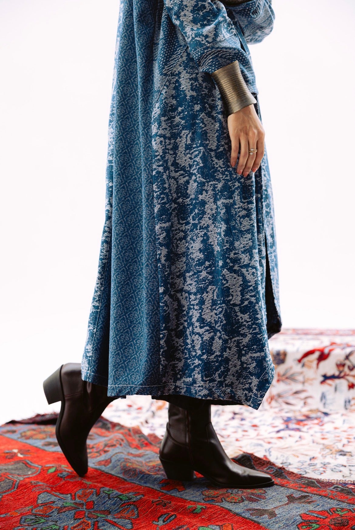 Hooded kimono blends depth and fluidity in layered shades of blue. The textured pattern evokes movement.
