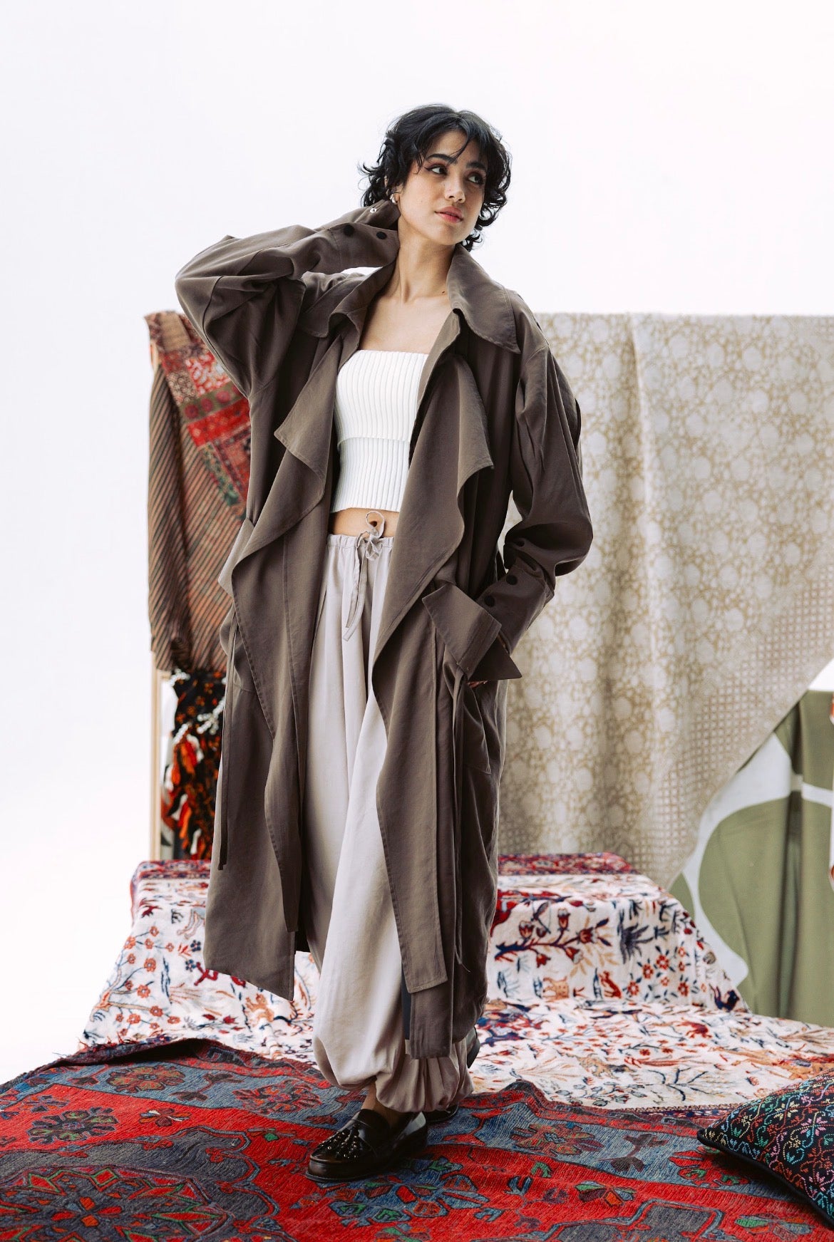 A statement layer that embodies strength and fluid elegance. Designed with a softly structured silhouette, an oversized collar, and a graceful waterfall front, this jacket moves effortlessly with every step. Functional side pockets and subtle sleeve strap details add both practicality and character.